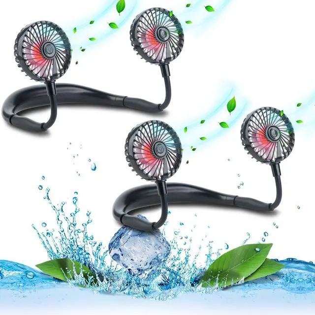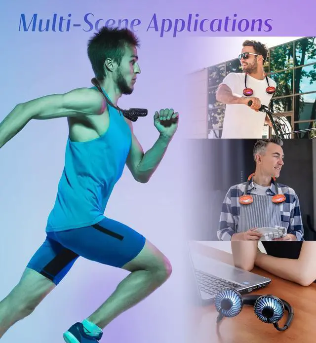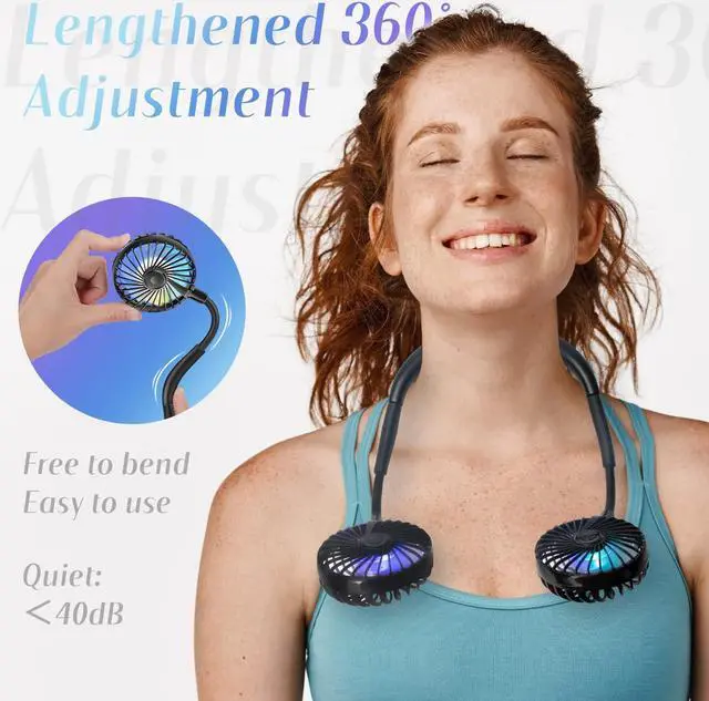 Super Quiet and Lightweight Portable Neck FanBuilt-in pure copper brushless motor not only provides strong wind, but also low noise, perfect for working indoors and reading. The portable neck fan is maded of new low-consumption materials and weighs only 6.3 oz/180g. The comfortable neck strap design won't cause a lot of burden on your neck when worn for a long time. You can easily hang the fan around your neck for any outdoor sports, such as biking, hiking, camping, fishing, golfing, running, traveling, etc.