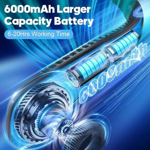 Big Capacity & Long Working TimeThis cooling neck fan is your perfect long-hour working partner, running for 6-20 hours when fully charged (depending on different speeds or temperatures) thanks to its large-capacity batteries. Simply press the fan button and enjoy moving cold storage