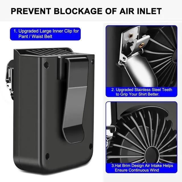 Hands-Free Design for All Your Needs: It comes with a sturdy clip that allows it to securely hang on your belt. It also features two additional clips for your clothes, ensuring the air inlet is never blocked. Whether you're working in a warehouse or hiking in the great outdoors, our fan provides continuous pleasure and enjoyment without getting in your way.