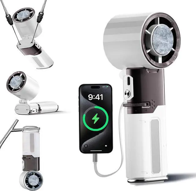 [6000mAh Large Battery + Power Bank Function] The rechargeable handheld fan features a built-in 6000mAh long-life battery for all-day operation without frequent charging. 10-21hr runtime (varies by speed). A Type-C port allows reverse charging for your phone, making it ideal for outdoors, travel, home, or desk use