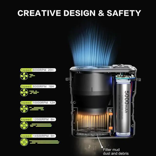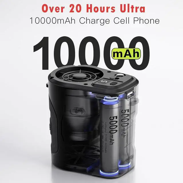 5-Speed Adjustable POWERFUL AND QUIET: The wearable fan has 5 speeds to choose from: low, medium, and high, with a high rotational speed, the highest speed of up to 15,000rpm generates superb wind power while keeping the noise level low (50dB). Dual-control switch design, LED power display, LED super bright outdoor emergency light, can irradiate dozens of metres away; 5-speed strong airflowNewly upgraded 15,000rpm motor can blow a strong airflow of up to 20m/s. The super strong wind can take away the body heat within seconds.