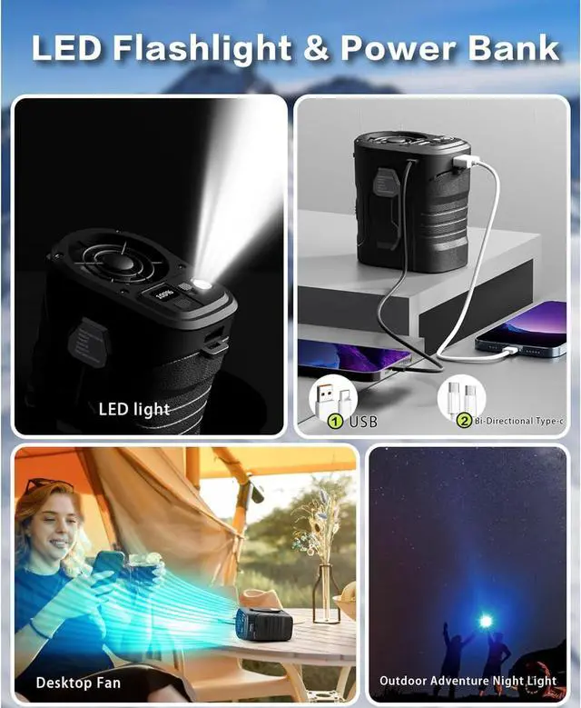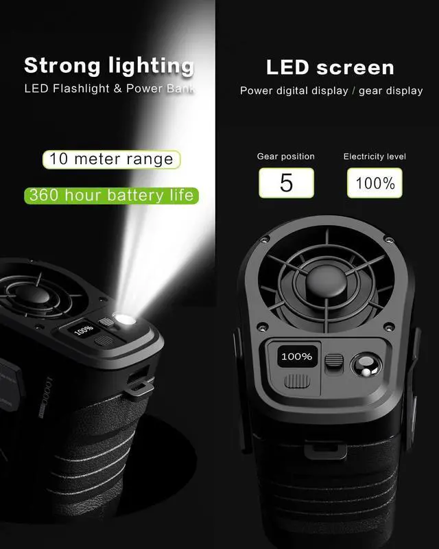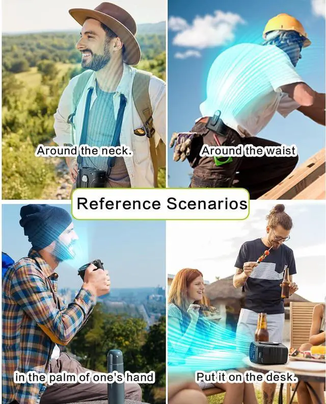Waist Fan and Necklace Fan 2 in 1Can be waist mounted for easy wear, also can be neck mounted, desktop & handheld for blowing air. This is a multi-functional portable USB fan - waist clip fan, necklace fan, mobile power and LED flashlight. The cooling fan housing is made of polymer plastic material, sturdy and durable for long term outdoor use, perfect for office workers, gardening, farming, hiking, fishing, biking, camping and travelling and other various outdoor activities.