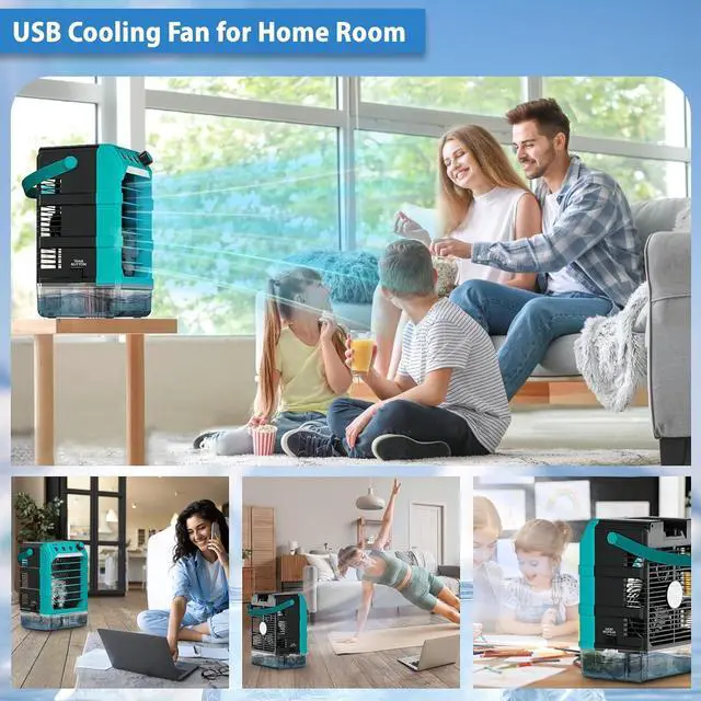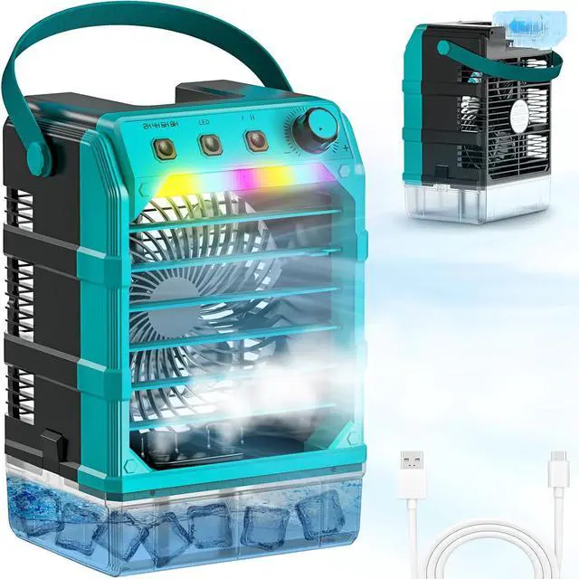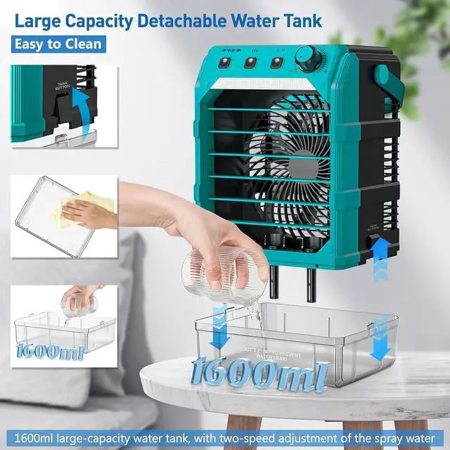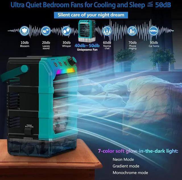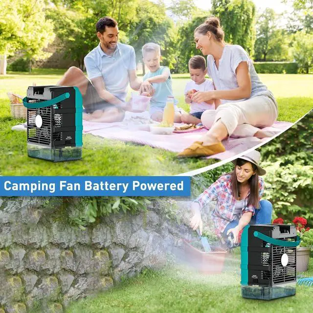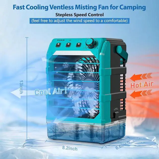 6-In-1 Portable Fan: Portable misting fan combines the functions of a fan, ice fan, water fans for cooling outside, misting, humidifier, and night light, which can immediately make you feel cooling and increase humidity for a dual cooling effect