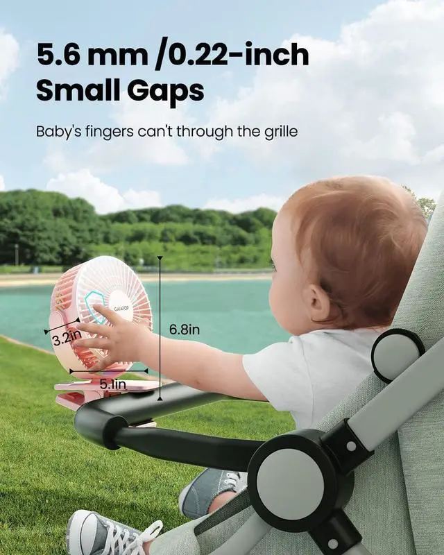 Also Safe for Baby: The mini clip fan only has 5.5mm gaps, so it will protect the infant's little fingers from entering; While keeping toddlers safe, still works quietly and provides powerful wind