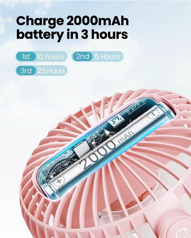 USB or Rechargeable Battery Operated: The clip-on fan has a 2000 mAh battery that can last from 3.5/6/10 hours(Depending on speeds), can be used while charging; suit for desks, strollers, camping, car seats; your beach/camping/travel essentials