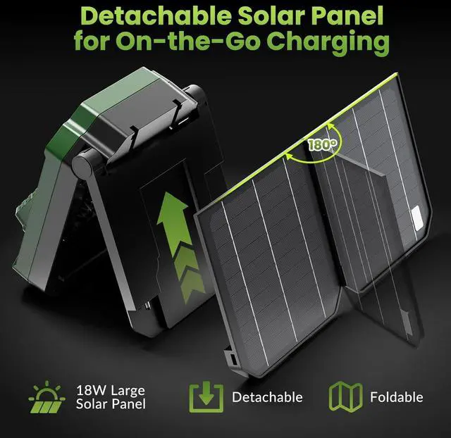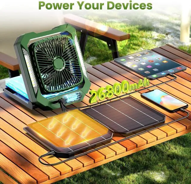 Solar-Powered & Multi-Functional: The foldable and detachable solar panel not only charges the fan itself but also acts as a portable power source to charge other devices, making it perfect for camping, hiking, and emergencies. Never worry about running out of power