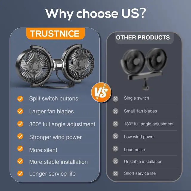 Dual Head Design for Double Cooling: Trustnice Car Seat Fan offers a dual-head design with independent switches for separate airflow control. Enjoy personalized cooling for both the front and backseat, keeping kids and pets comfortable