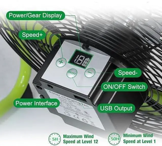 Durable Build & Additional Features: Constructed from solid metal and aluminum alloy, the fan is waterproof and rust - proof, ensuring long - term use. The base is equipped with three ABS anti - slip buffer particles for stable operation. It also has a USB charging interface, which can be used to power 12V appliances like mobile phones. The electronic high - definition control panel shows the remaining battery power and wind speed gear in real - time, and the simple one - click operation for on/off and speed adjustment makes it user - friendly.