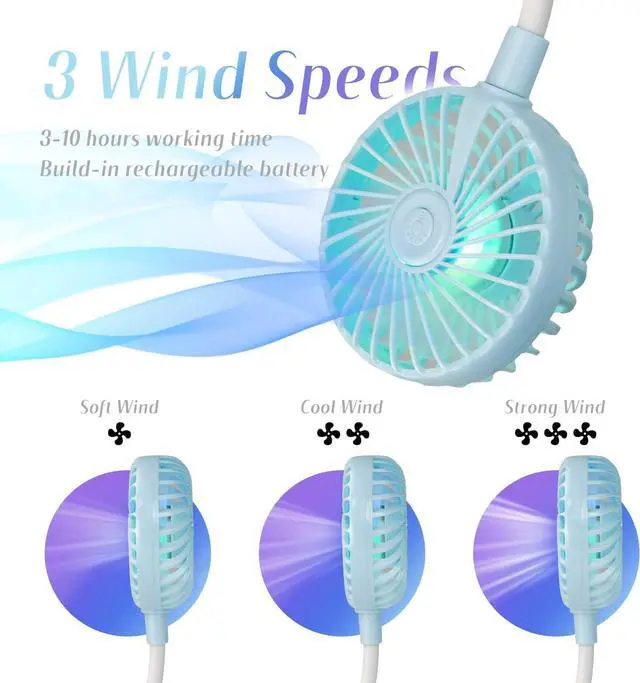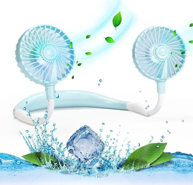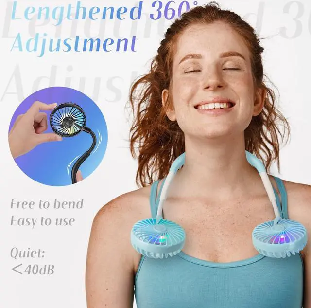 Super Quiet and Lightweight Portable Neck FanBuilt-in pure copper brushless motor not only provides strong wind, but also low noise, perfect for working indoors and reading. The portable neck fan is maded of new low-consumption materials and weighs only 6.3 oz/180g. The comfortable neck strap design won't cause a lot of burden on your neck when worn for a long time. You can easily hang the fan around your neck for any outdoor sports, such as biking, hiking, camping, fishing, golfing, running, traveling, etc.