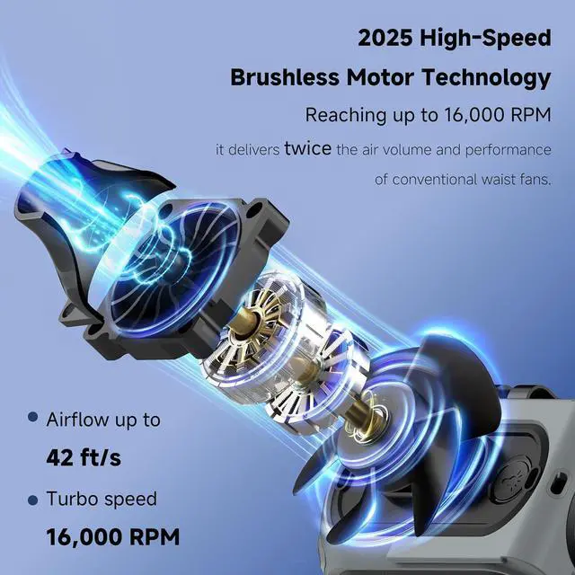 Up to 42 Feet of Turbo Wind: Stay cooler, faster. A 1.54-inch wide outlet boosts airflow coverage by 60% and cools 50% quicker. Powered by a high-speed 16,000 RPM brushless motor with 5 wind levels and max airflow up to 42 ft/s.