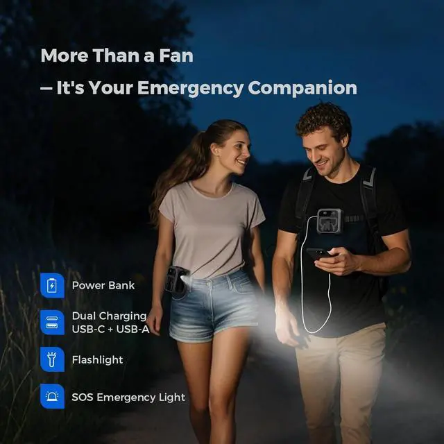 Built-in Flashlight with SOS Mode: Stay prepared with a built-in LED flashlight and SOS function for added safety during night, hikes, or emergencies. A shock-absorbing silicone cover helps protect the fan from accidental drops and daily wear, making it tough enough for real-world use.