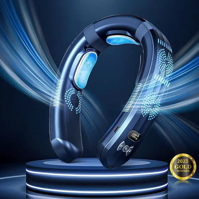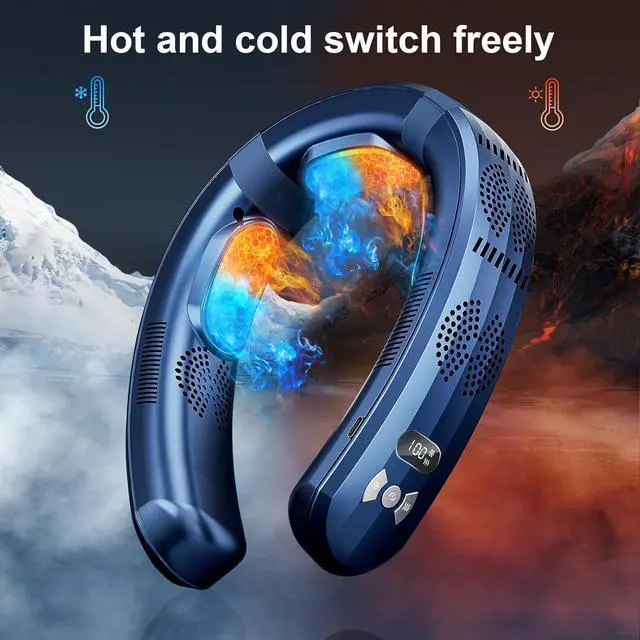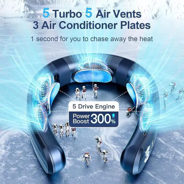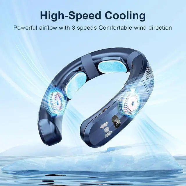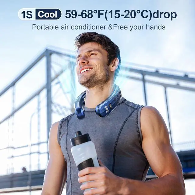 Wearable Air Conditioner This portable neck fan allows you to stay cool while freeing up your hands for other tasks. Three fans and three cooling pads provide steady blowing and cooling. Flexible adjustability allows you to adjust the angle for maximum comfort.