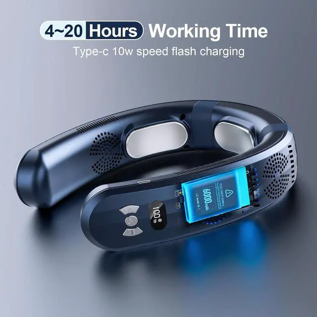 1s Cool Down & 3D AirflowThis air conditioner neck fan has three high-quality cooling plates and 3-core powerful blowing air that can quickly cool the air around you. 6000 mAh is enough power to use 3-8 hours. Whether you are exercising, working, or just hanging out, you will immediately feel refreshed and comfortable.