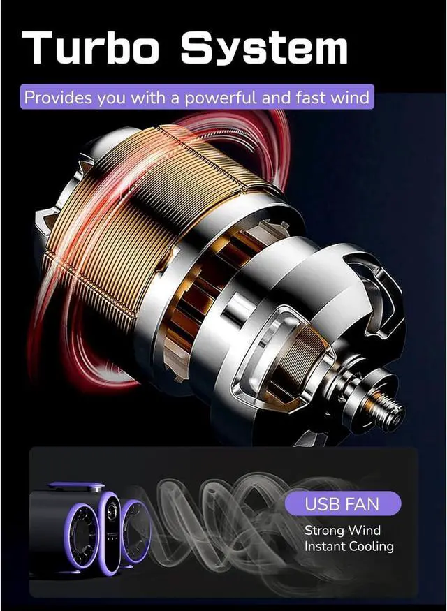 Turbo Wind Power: Rechargeable Waist Fan rapidly compresses hot air into cool airflow, covering the whole body with large 5 blade turbine spiral fan. 3 speeds smooth switching reduces noise for a comfortable experience.