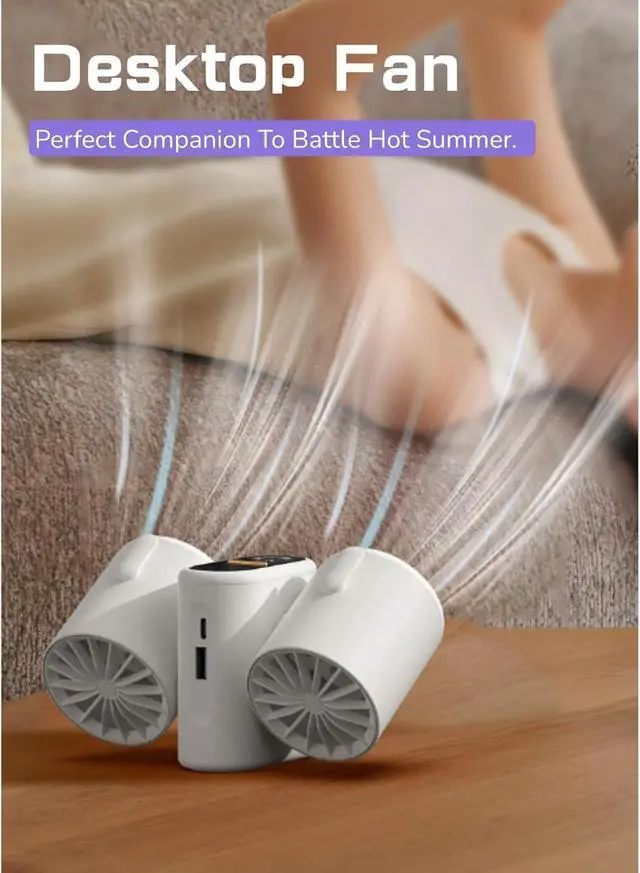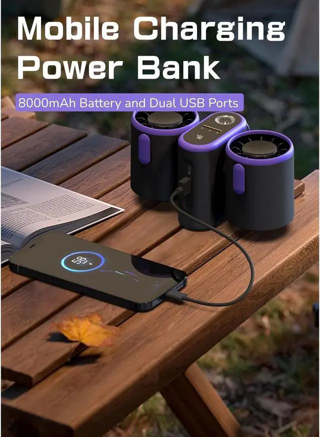Charging Cooling 2 in 1: This USB Turbo Fan is powered by 8000mAh high capacity battery and built in USB output interface, which can double up as a power bank to your mobile devices in an emergency.