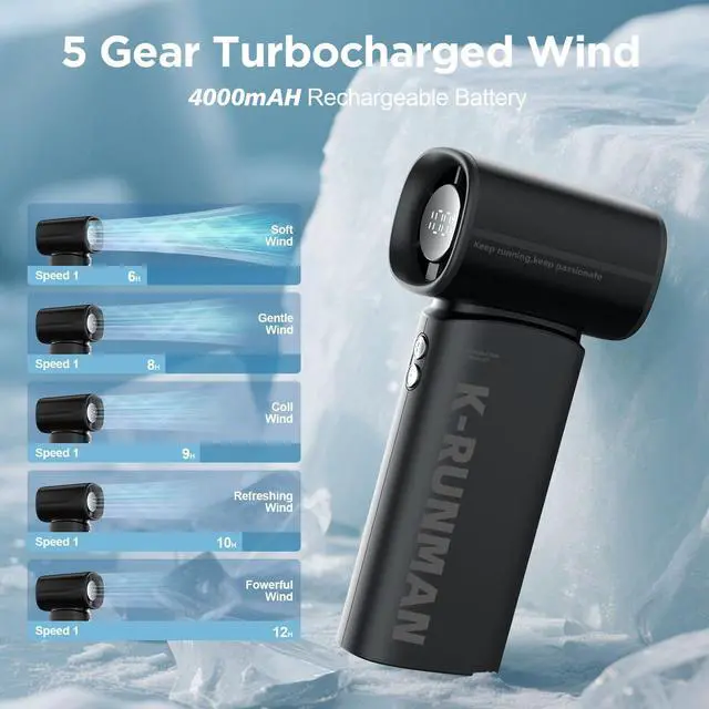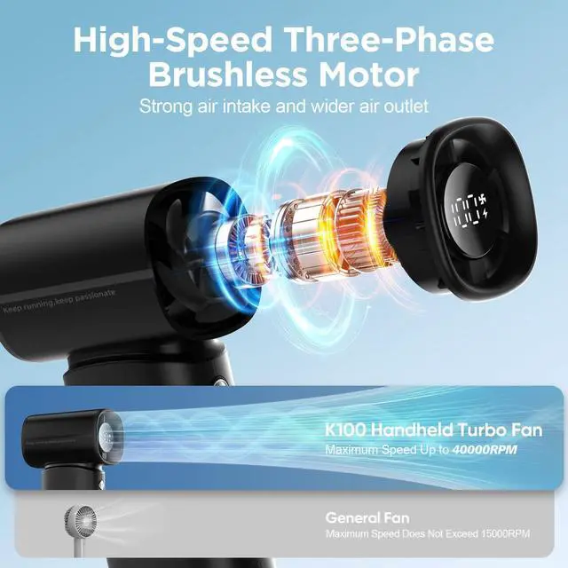 K100 Powerful Portable Fan has 5 gear turbo wind for potent cooling. high-speed three-phase brushless motor, with a maximum wind speed of up to 10m/s. Maximum speed is 40,000 rpm, which is 3 times that of ordinary handheld fans. Perfect for relieving the heat during hot journeys.