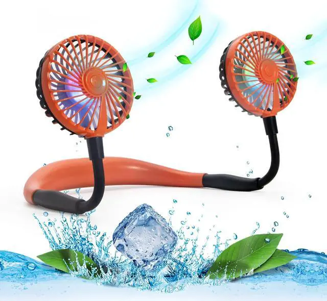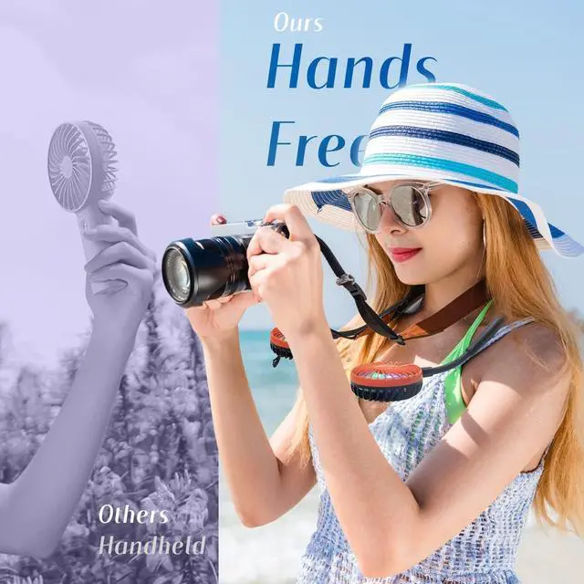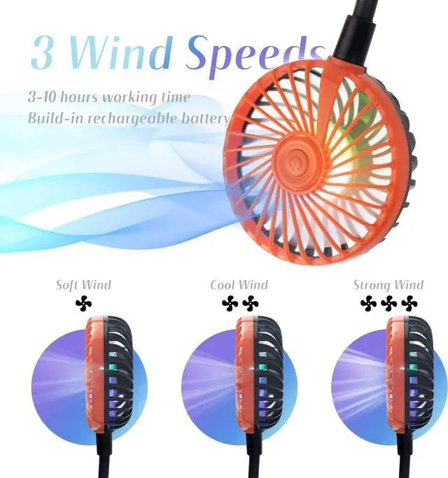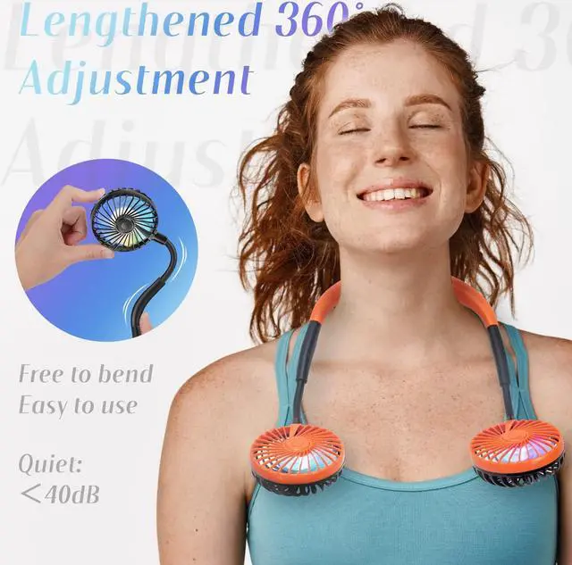 Super Quiet and Lightweight Portable Neck FanBuilt-in pure copper brushless motor not only provides strong wind, but also low noise, perfect for working indoors and reading. The portable neck fan is maded of new low-consumption materials and weighs only 6.3 oz/180g. The comfortable neck strap design won't cause a lot of burden on your neck when worn for a long time. You can easily hang the fan around your neck for any outdoor sports, such as biking, hiking, camping, fishing, golfing, running, traveling, etc.