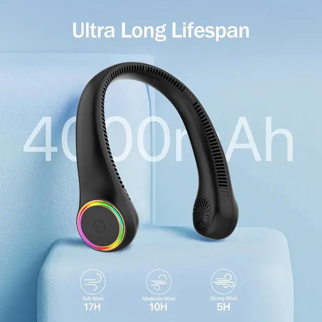 Long-Lasting Battery Life: Equipped with a powerful 4000mAh battery, our neck fan offers extended use with up to several hours of runtime on a single charge. Whether you're exploring the great outdoors, enjoying a festival, or just relaxing at home, stay cool and comfortable all day long without the constant need for recharging.