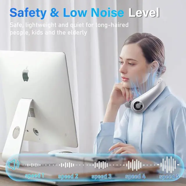 5-Speed Adjustable Cooling Enjoy customizable comfort with 5 speed settings, from a gentle breeze to a powerful gust. This adaptability makes neck fan rechargeable ideal for diverse scenarios: Hiking/Outdoors: Set to medium speed for sustained cooling on trails; Park Outings: Crank to high speed for rapid cooldown while taking kids to the park on hot days; Office Break: Switch to low speed for a quiet, gentle breeze during your lunch break; Home Relaxation: Choose a comfortable natural wind setting while reading.