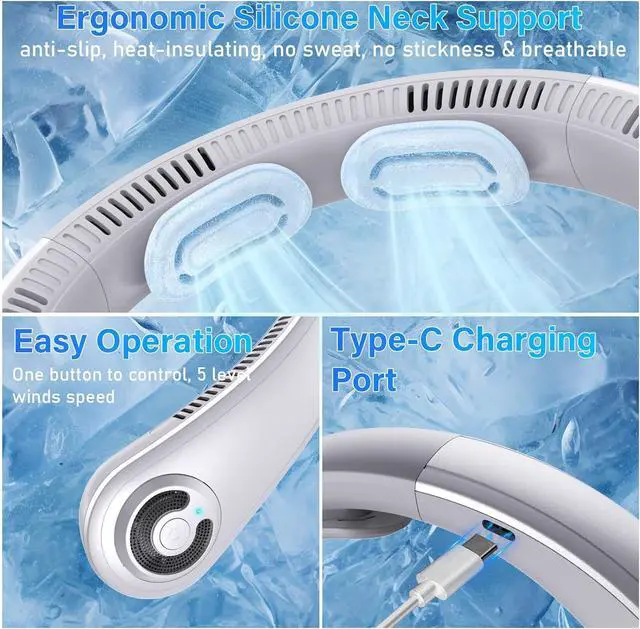 • Non-slip Support & Rechargeable Neck Fan Designed with a non-slip neck support and ergonomic fit, this cooling neck fan suits all ages. The battery of portable neck fan rechargeable delivers hours runtime (varies by speed). USB-C fast charging makes powering up incredibly practical: quickly top up with a power bank during your commute, plug into your laptop while working at your desk, or use a wall charger at home to prepare for your next outing. Perfe