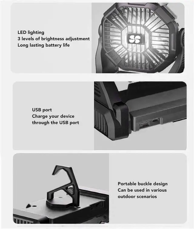 CAMPING FAN WITH LED LANTERN: The portable fan has 3 brightness settings, you can adjust different brightness according to different scenarios, ideal light source for night camping or hiking.