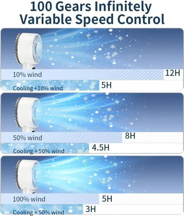 [100 Gear Speed wind & Smart LED Display] - The stepless 100-level adjustable wind speed and one-touch buttons for the cooling/wind modes make it more convenient to use. The high-definition digital display allows you to easily check the current mode and the battery level. Customize your comfort level in seconds gentle breeze or powerful cooling.