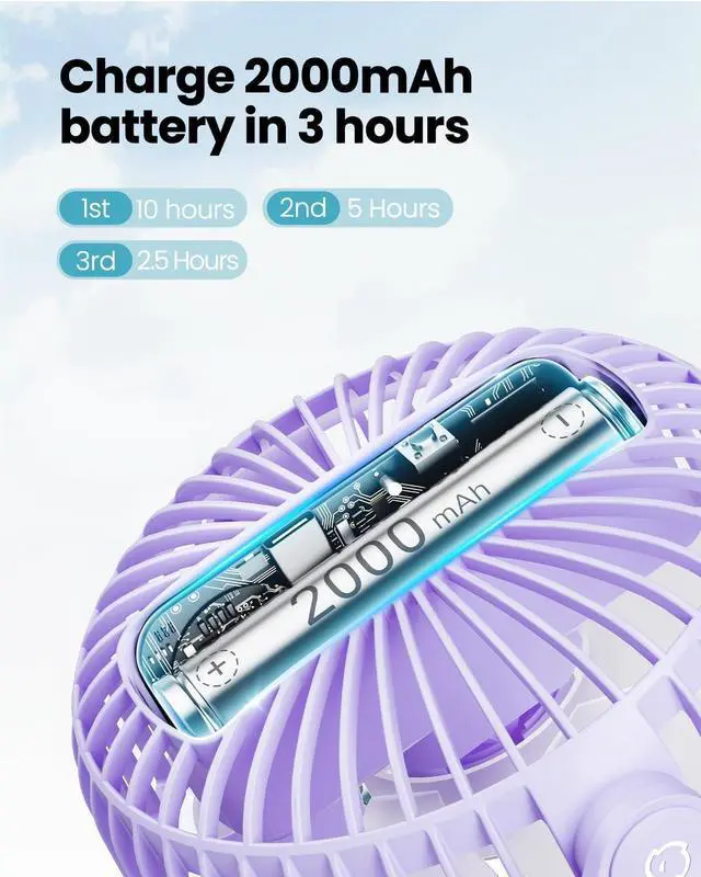 USB or Rechargeable Battery Operated: The clip-on fan has a 2000 mAh battery that can last from 3.5/6/10 hours(Depending on speeds), can be used while charging; suit for desks, strollers, camping, car seats; your beach/camping/travel essentials