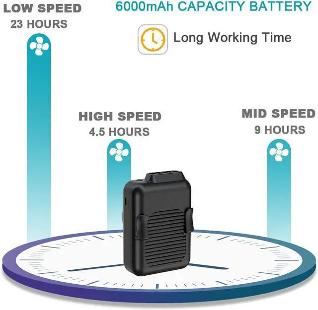 Long Working Time - Build-in 6000mAh large capacity Polymer battery, supports up to 23 hours all day working time, and the motor won't overheat, enjoy the cool wind all day!