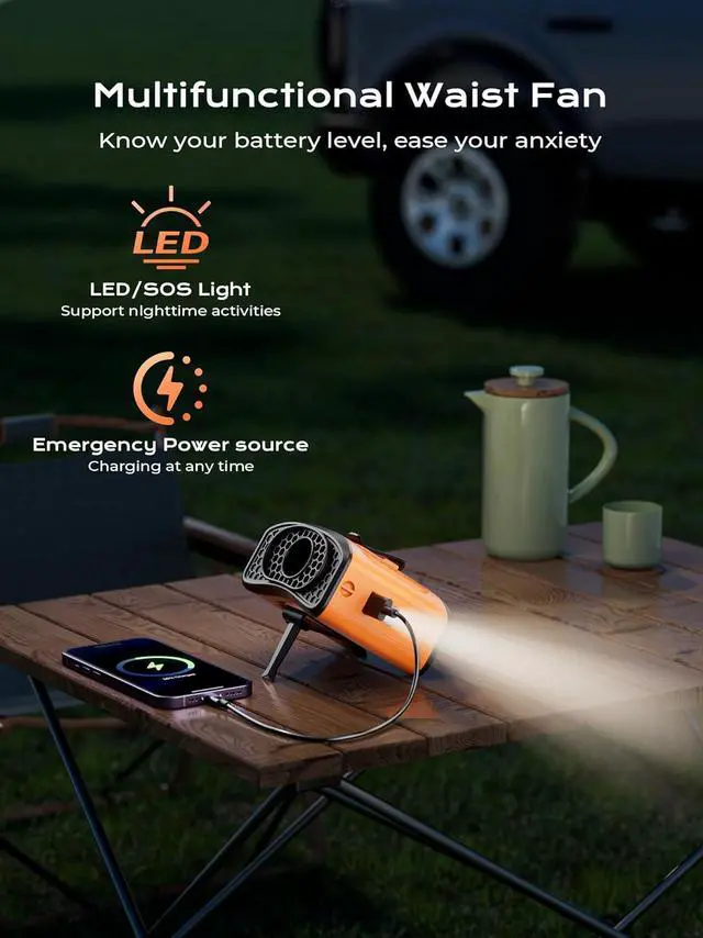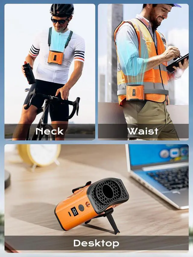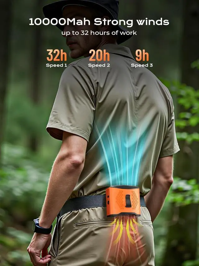 4-Speed Hands-Free Cooling AnywhereAttach this waist fan to your body with the adjustable strap, place it on your desk with the built-in stand, or hang it around your neck! Enjoy 4 adjustable speeds (22H low to 8H high speed) for personalized cooling during hiking, working, or emergencies.