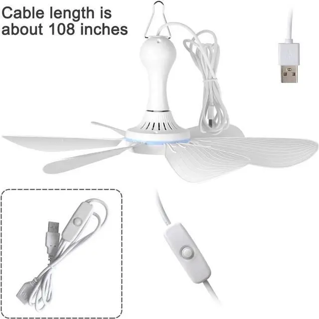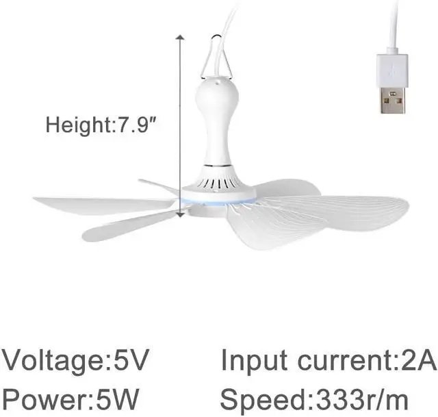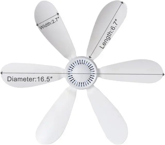6 blades, Ceiling fan swivel diameter 16.5 inches, a single blade is 6.7 inches long and 2.7 inches wide, Ceiling fan height 6.1 inches, Ceiling Fan Hook Height 1.8 inches, Comes with USB cable 69 inches long(Each variant has different line lengths, please see detailed parameters), 5W power.