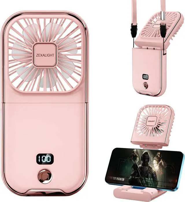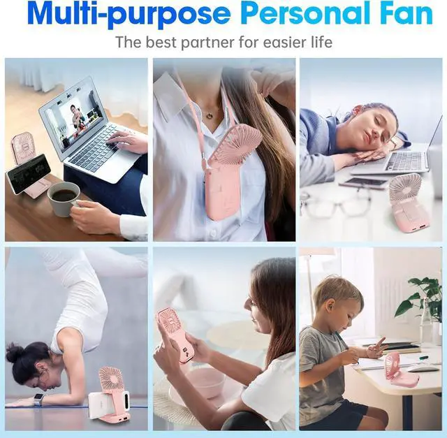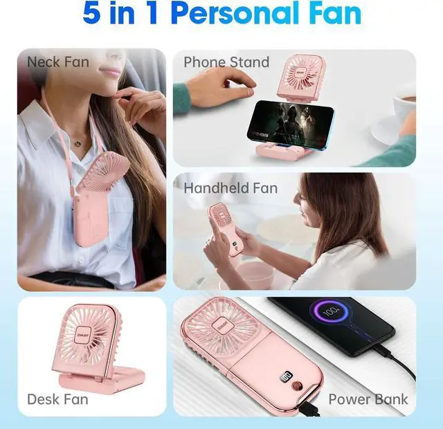 Mini Fan, Larger Use - Combined with Handheld Fan, Necklace Fan, Desk Fan, Phone Stand, Power Bank in one mini foldable Fan. Only 130g Size: 6.7"*3.14"*0.7".