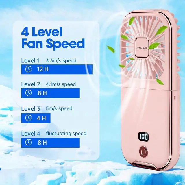 4 Speeds Airflow - The portable fan can be fully charged in only 2.5 hours. After fully charged, Level 1 speed 3.3m/s for 12 hours, Level 2 speed 4.1m/s for 8 hours, Level 3 speed 5m/s for 4 hours, Level 4 Natural breeze for 8 hours.