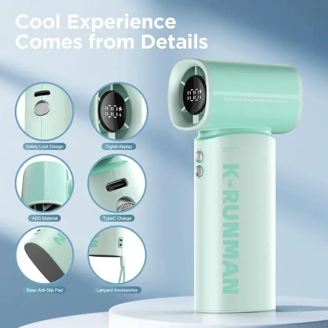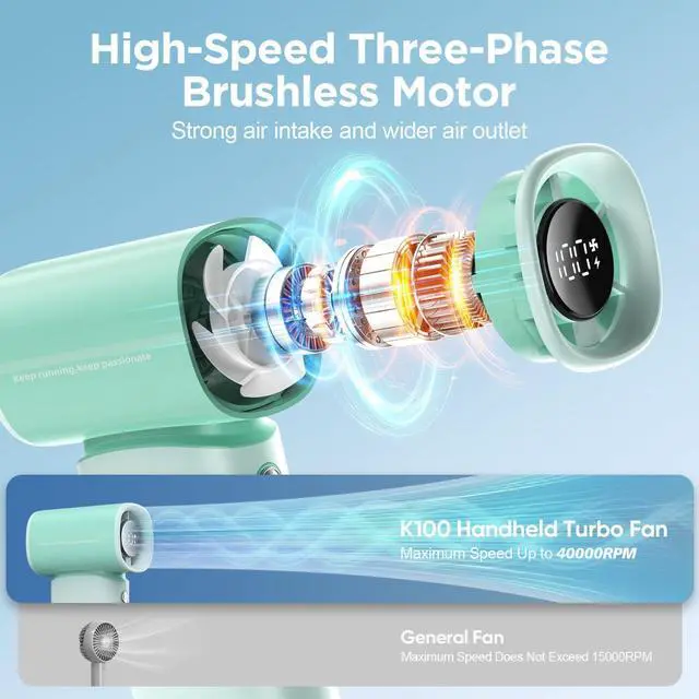 K100 Powerful Portable Fan has 5 gear turbo wind for potent cooling. high-speed three-phase brushless motor, with a maximum wind speed of up to 10m/s. Maximum speed is 40,000 rpm, which is 3 times that of ordinary handheld fans. Perfect for relieving the heat during hot journeys.