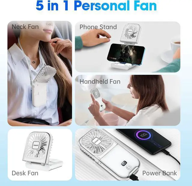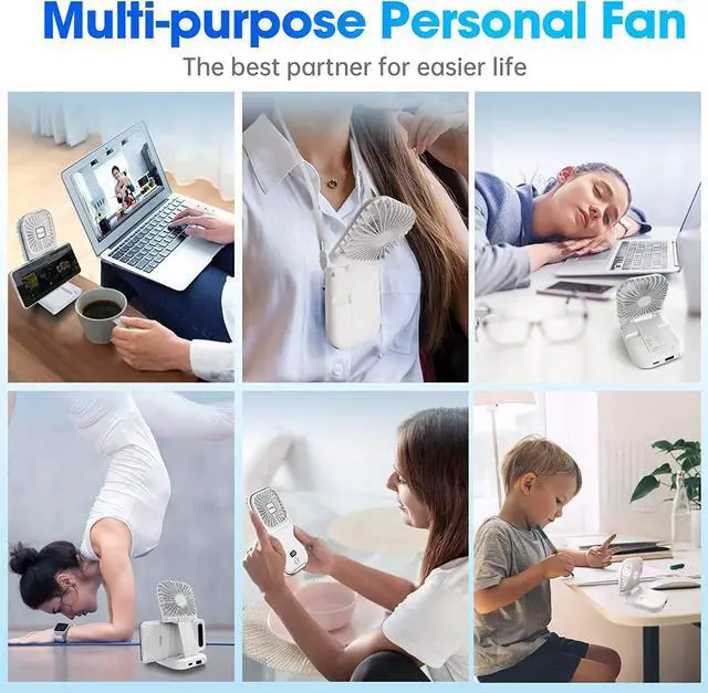 Mini Fan, Larger Use - Combined with Handheld Fan, Necklace Fan, Desk Fan, Phone Stand, Power Bank in one mini foldable Fan. Only 130g Size: 6.7"*3.14"*0.7".