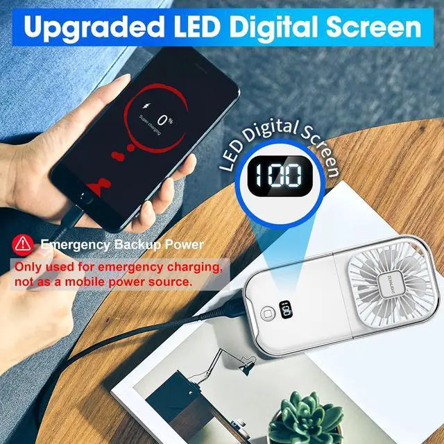 Emergency Backup Power - Battery operated fan, with built-in 3000mAh high-capacity battery. It can be used as an emergency backup power to charge your phone.