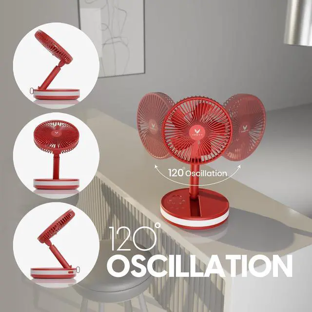 VENTY Portable Fan - Wireless Battery Operated Fan, 48HR Run Time 16000MAH Battery, Oscillating Rechargeable Fan, Remote Control & LED Lighting, Folding Telescopic Camping Fan (Red with Case)