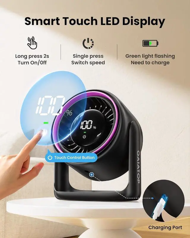 Intuitive Touch-Sensitive LED Display: Control your quiet desk fan with a simple touch. Turn the USB rechargeable table top fan on/off with a 2-second hold, and toggle seamlessly between 5 precise speed settings with a simple tap. The smart LED display clearly shows battery life before elegantly returning to gear infocombining elegance and functionality in your personal desktop fan