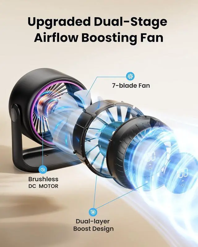 Advanced Dual-Stage Turbo Cooling Desk Fan: Experience powerful and refined airflow with our innovative dual-stage system, delivering a brisk max speed of 5.2 m/s. Seven strategically curved blades work in harmony to amplify wind pressure and ensure smooth, even circulationkeeping you comfortably cool all day