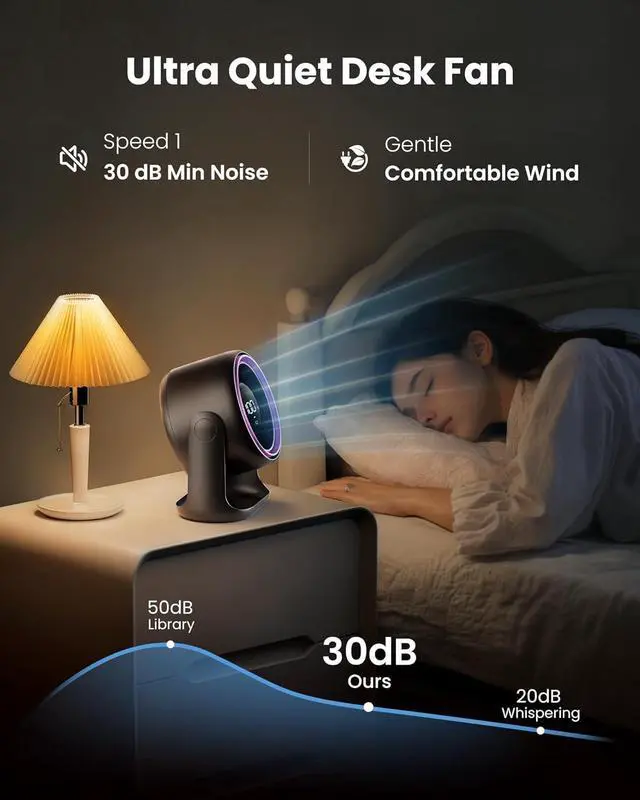 Ultra-Quiet & Energy-Efficient Office Fan: Designed for focus and relaxation. Our quiet fan technology with a brushless motor and noise-reduction structure operates as low as 30dBquieter than a library whisper. Optimized power use makes this energy efficient desk fan perfect for light sleepers and shared spaces