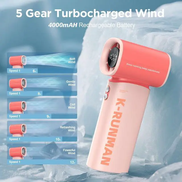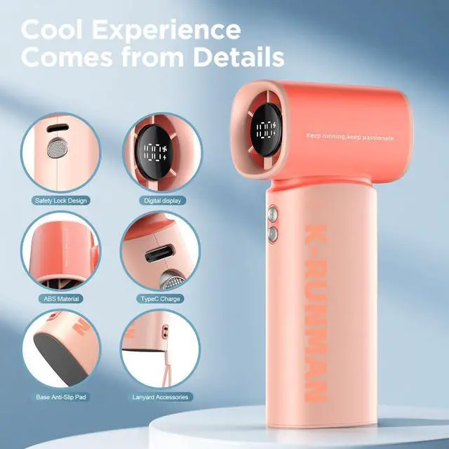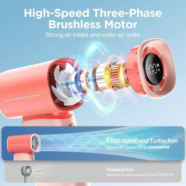 K100 Powerful Portable Fan has 5 gear turbo wind for potent cooling. high-speed three-phase brushless motor, with a maximum wind speed of up to 10m/s. Maximum speed is 40,000 rpm, which is 3 times that of ordinary handheld fans. Perfect for relieving the heat during hot journeys.