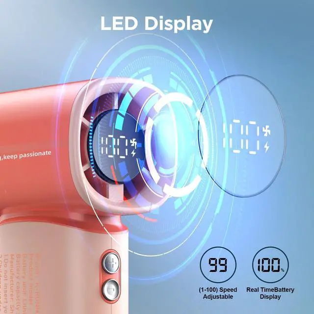 - Elevate your cooling experience with our innovative mini fan featuring an LED digital display.Stay informed at a glance as you effortlessly monitor fan speeds, mode settings, and battery life,and the wind speed from 1 to 100 can be adjusted steplessly,The portable fan can customize speeds , ensuring uninterrupted comfort during various activities such as gardening, traveling, camping, hiking, biking, and concerts