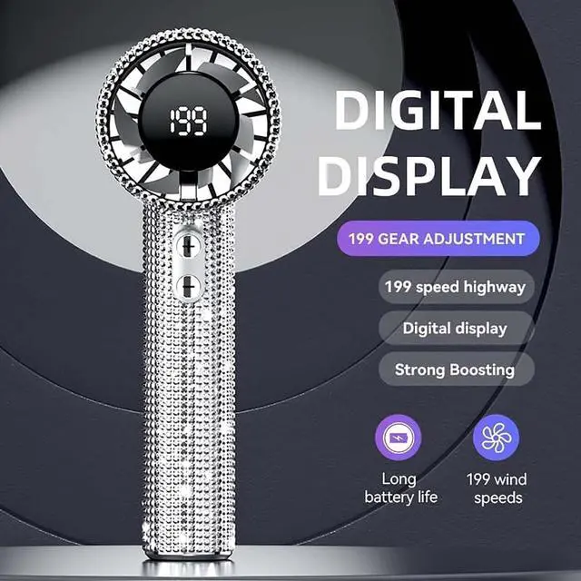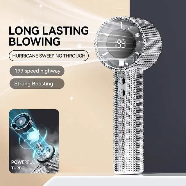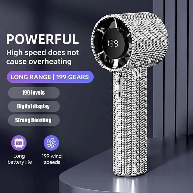 Turbocharged Cooling with 199-Speed Control: Experience ultra-powerful airflow with this Full Diamond Luxury Handheld Turbo Fan, featuring a high-efficiency brushless motor reaching 15,000 RPM (3x faster than standard fans). Choose from 199 adjustable wind speedsfrom a soft makeup-setting breeze to a 9m/s turbo gustfor personalized comfort anywhere.