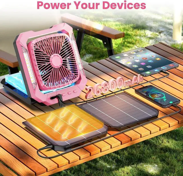 Solar-Powered & Multi-Functional: The foldable and detachable solar panel not only charges the fan itself but also acts as a portable power source to charge other devices, making it perfect for camping, hiking, and emergencies. Never worry about running out of power