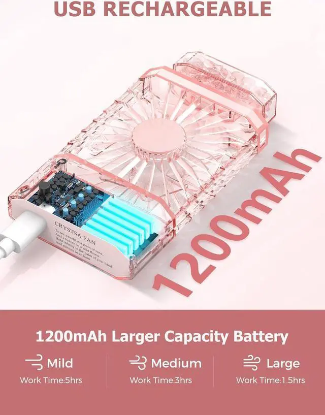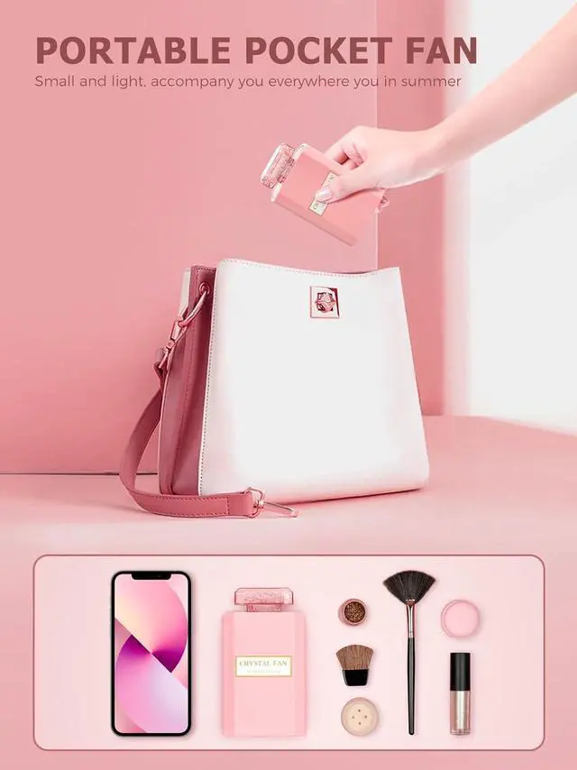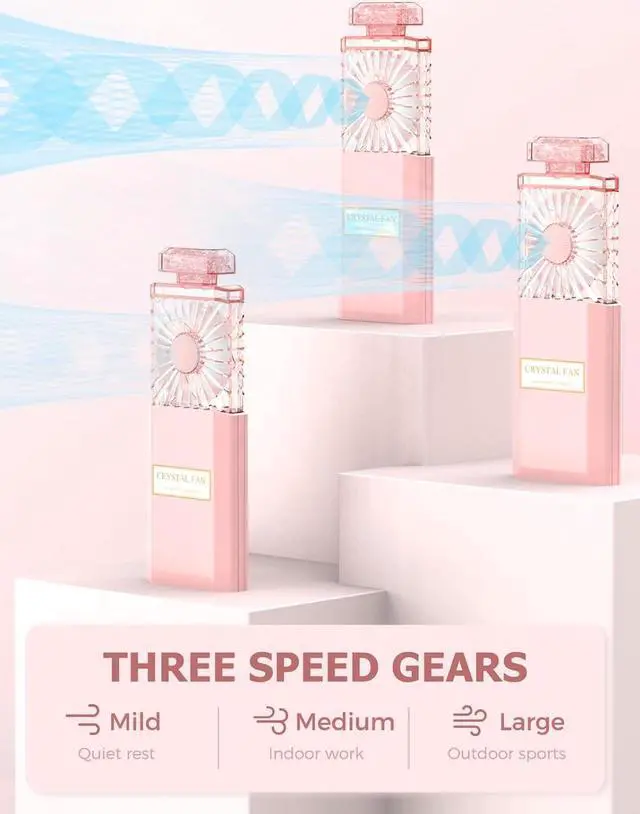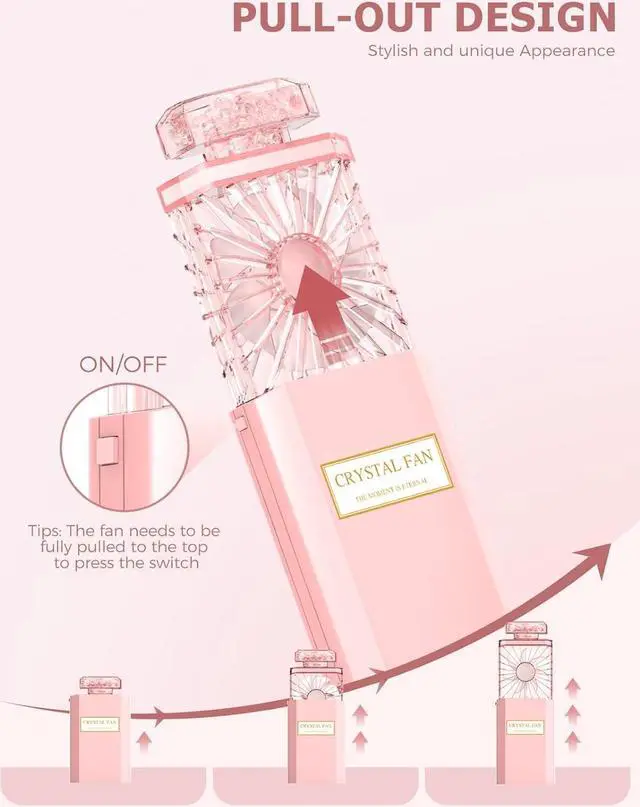 PORTABLE DESIGNPortable personal fan has like perfume bottle, pull-out designeasily put in your handbag or pocket. This handheld fan so lightweight only weighs 125g. Easy carried for you to work, travel, school and keep cool whether outdoors or indoors in summer