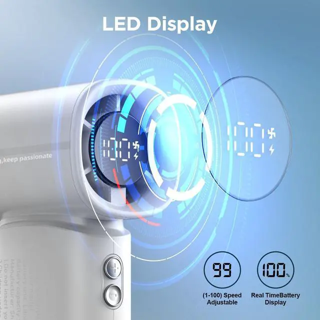 - Elevate your cooling experience with our innovative mini fan featuring an LED digital display.Stay informed at a glance as you effortlessly monitor fan speeds, mode settings, and battery life,and the wind speed from 1 to 100 can be adjusted steplessly,The portable fan can customize speeds , ensuring uninterrupted comfort during various activities such as gardening, traveling, camping, hiking, biking, and concerts