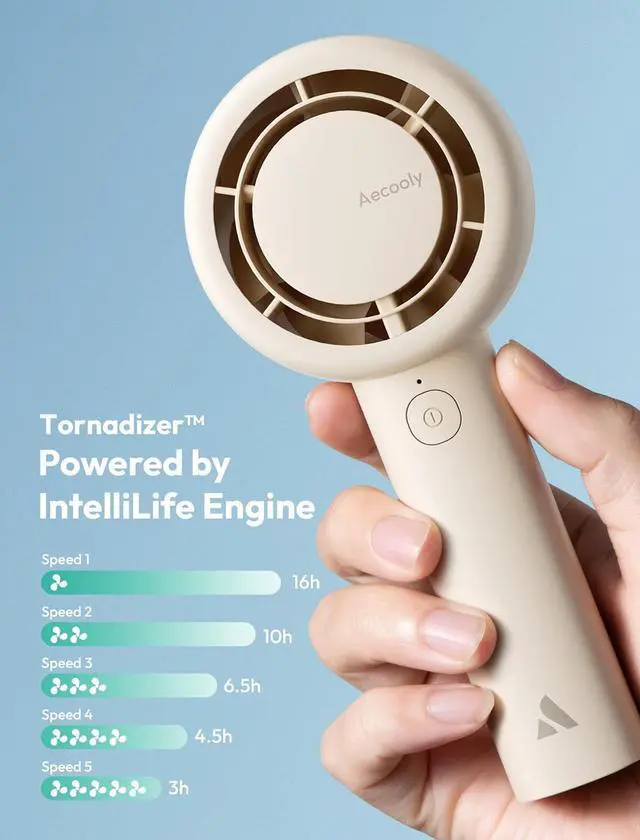 Handheld & Desktop: Aecooly Rechargeable Fan Designed to fit both your workspace and your on-the-go lifestyle, the fan can be used in desktop mode when working or relaxing at home, or easily switched to handheld mode for portable cooling during travel, walks, or outdoor events