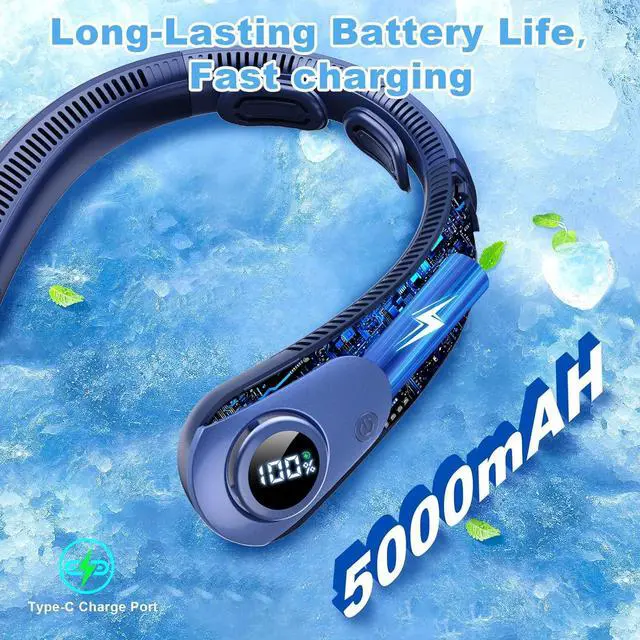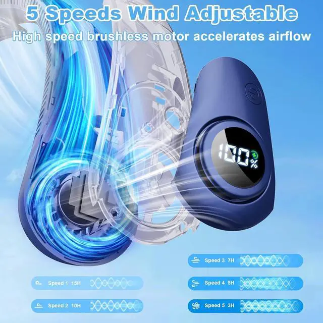 5 Adjustable Speed Settings & LED Digital Display Experience customized comfort with this portable neck fans that blow cold air rechargeable. Easily cycle through 5 wind speeds (gentle breeze to powerful airflow) using intuitive button controls. The integrated LED display clearly shows battery percentage and selected speed level, ensuring you never unexpectedly drain power during outdoor