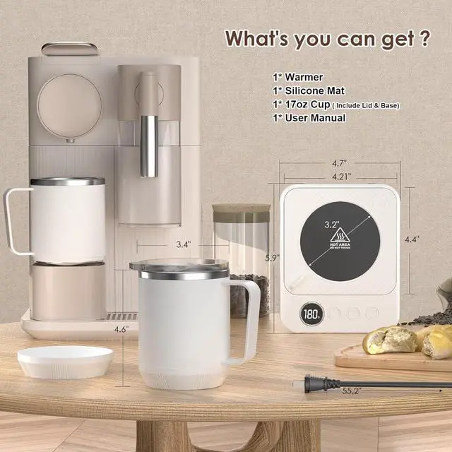 Multi-Functional WarmerThe mug heater has Large Heating Area ( L 4.4" * W 4.2"),no groove to limit the cup size, can fits most cups (ceramic, enamel, glass, stainless steel etc). Great for heating beverages, coffee, candles,tea, soups, chocolate, milk. This mug warmer set is definitely a great gift for coffee lovers.