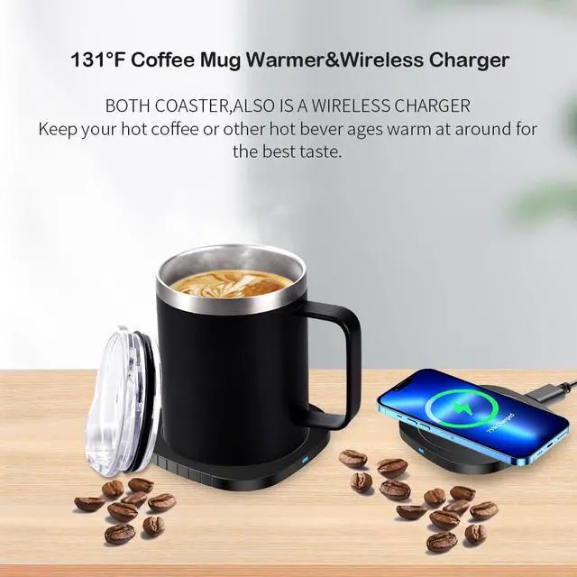 2 IN 1 Function: Coffee mug warmer built in receiving coil, it's aslo charger compatible with for IOS 13/12/12 Mini/11 Pro/for XR/XS/X/8/8 Plus, for S20/S10/S9/S8/Note 10, and other smart phone supporting charging.