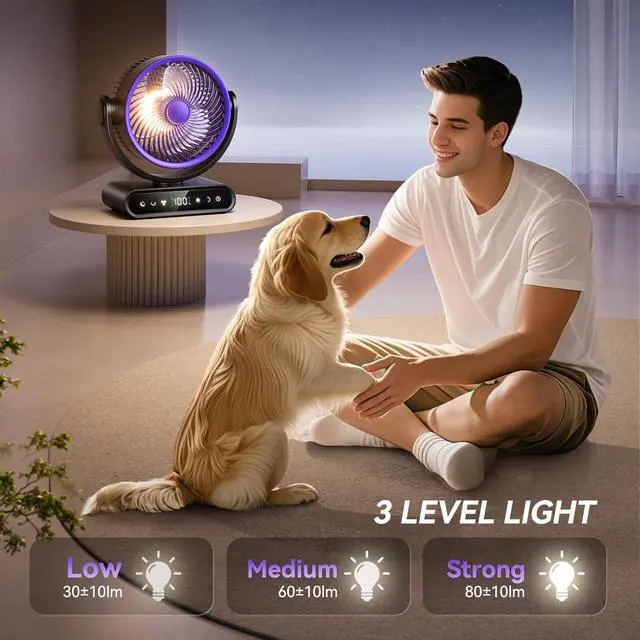Led Light:The camping fan with led light,which equipted 12 lamp beads. 3 speed light for adjust,low 30±10lm Middle 60±10lm Strong 80±10lm